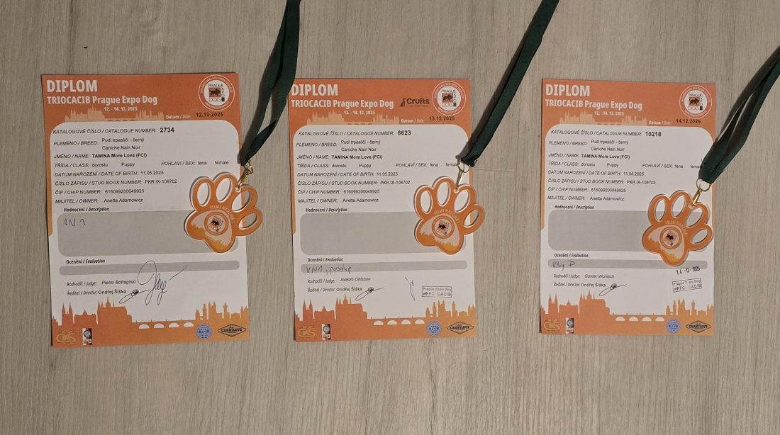 31.10.2025Po udanym debiucie wystawowym TAIGO More Love FCI , w dniu 12 października 2025 jego siostra TAMINA More Love FCI miała swój pierwszy dzień na wystawowym ringu w klasie młodszych szczeniąt. Z dużym opanowaniem i wdziękiem zaprezentowała się na Specjalistycznej Wystawie Pudli w Bytomiu zdobywając tytuł Najlepsze Młodsze Szczenię i otrzymała piękny opis . Cieszy mnie bardzo jak fajnie rozwijają się maluchy.Razem najlepiej zawsze i wszędzie.